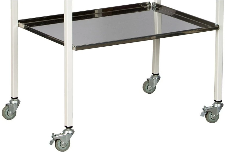 - Полки образуют два уровня хранения. Выполнены из высокопрочной нержавеющей стали 0.8 мм, устойчивой к возникновению трещин и сколов, а также к обработке дезинфицирующими средствами.
